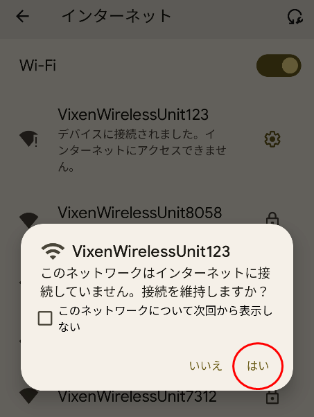 When connecting to the Wireless Unit, a pop-up will appear on your Android device asking whether to maintain the connection. Please select "YES".