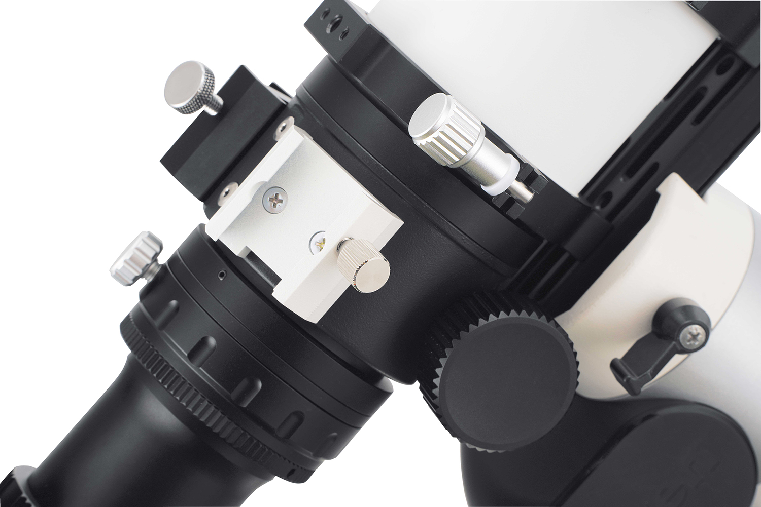 In addition to the finder bracket shoe provided, an optional dovetail finder bracket shoe can be attached to the focuser or on top of the tube rings.