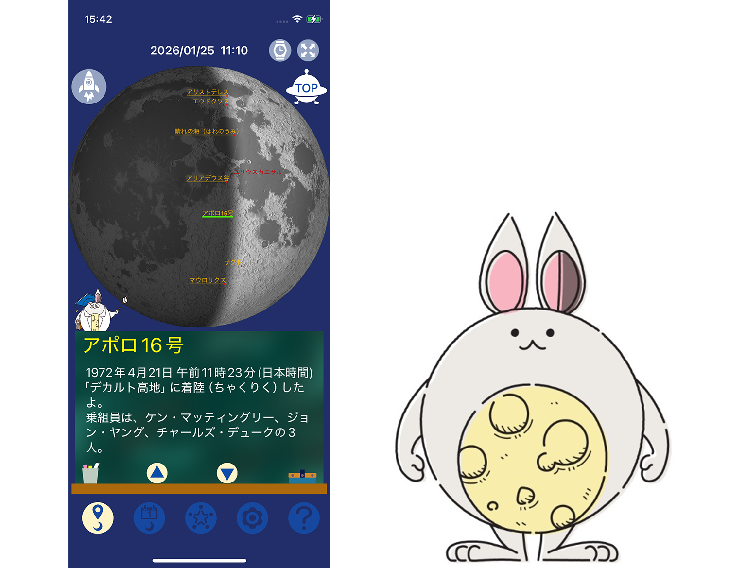 Open the dedicated MiruMOON app, and a cute rabbit-like guide appears to assist you. It gently leads you to where the Moon will be visible in the night sky.