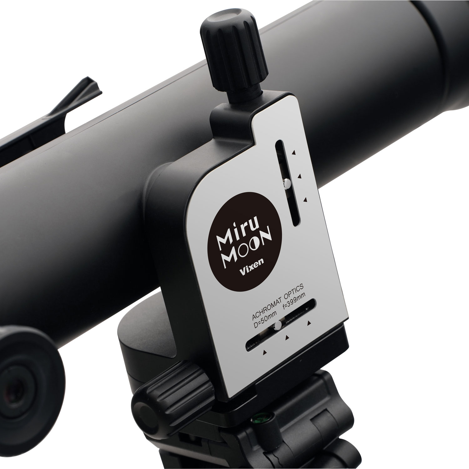 The MiruMOON telescope features two slow-motion knobs on its integrated alt-azimuth mount, allowing precise control of altitude (up and down) and azimuth (left and right).