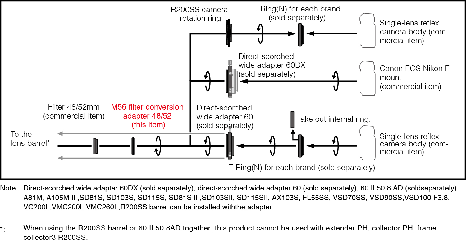 When using a commercially available filter in combination with a corrector lens, such as the reducer or flattener lens, attaching the “M56 Filter Conversion Adapter 48/52” to either the Wide Photo Adapter 60DX or the Wide Photo Adapter 60 allows the filter to be mounted closer to the camera mount than the conventional filter position at the front of the corrector lens.