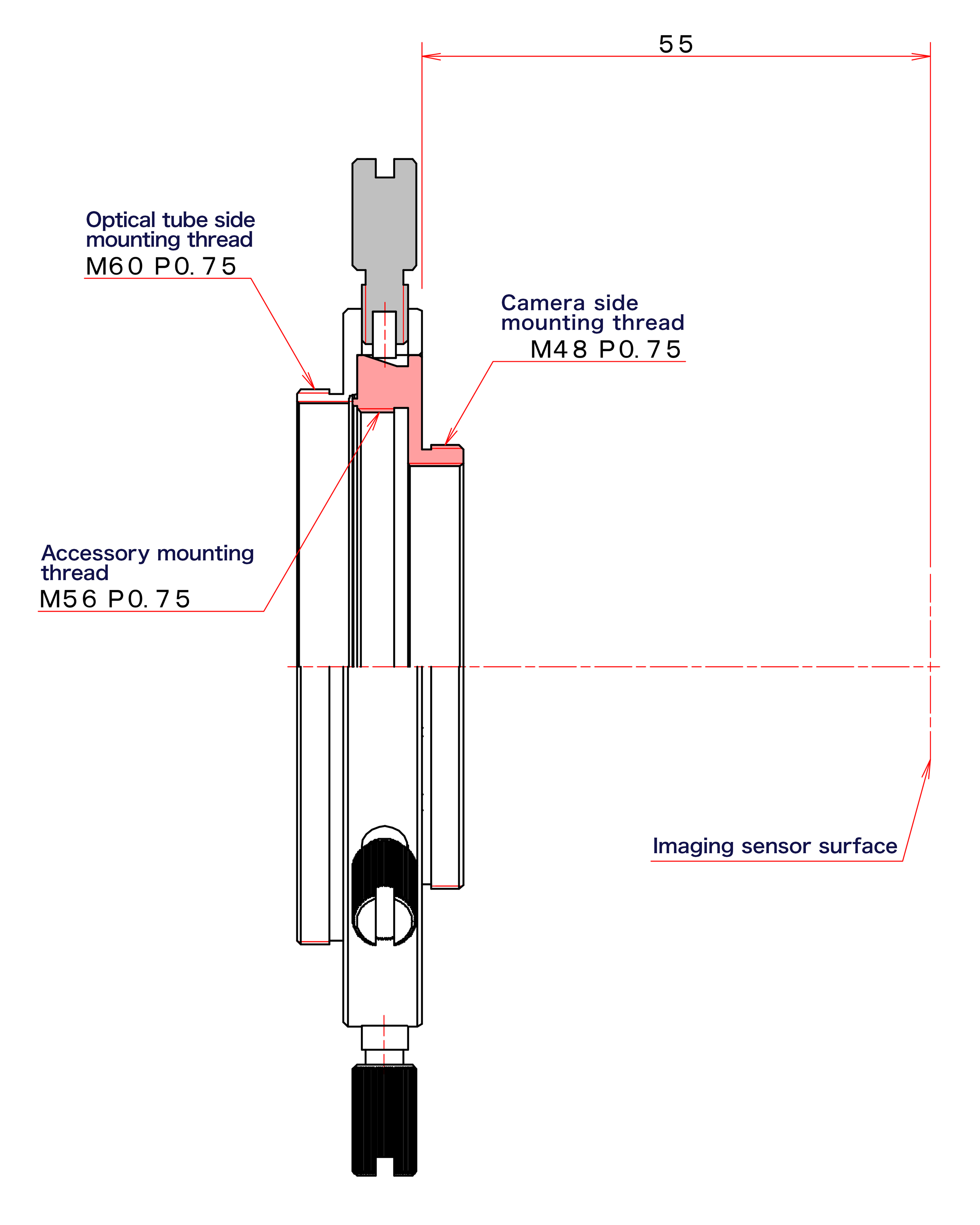 This adapter allows you to connect astro-imaging accessories with 48mm (P=0.75) female threads to the focusers on Vixen optical tubes. You can directly attach CMOS cameras (aftermarket product) equipped with M48 threads.