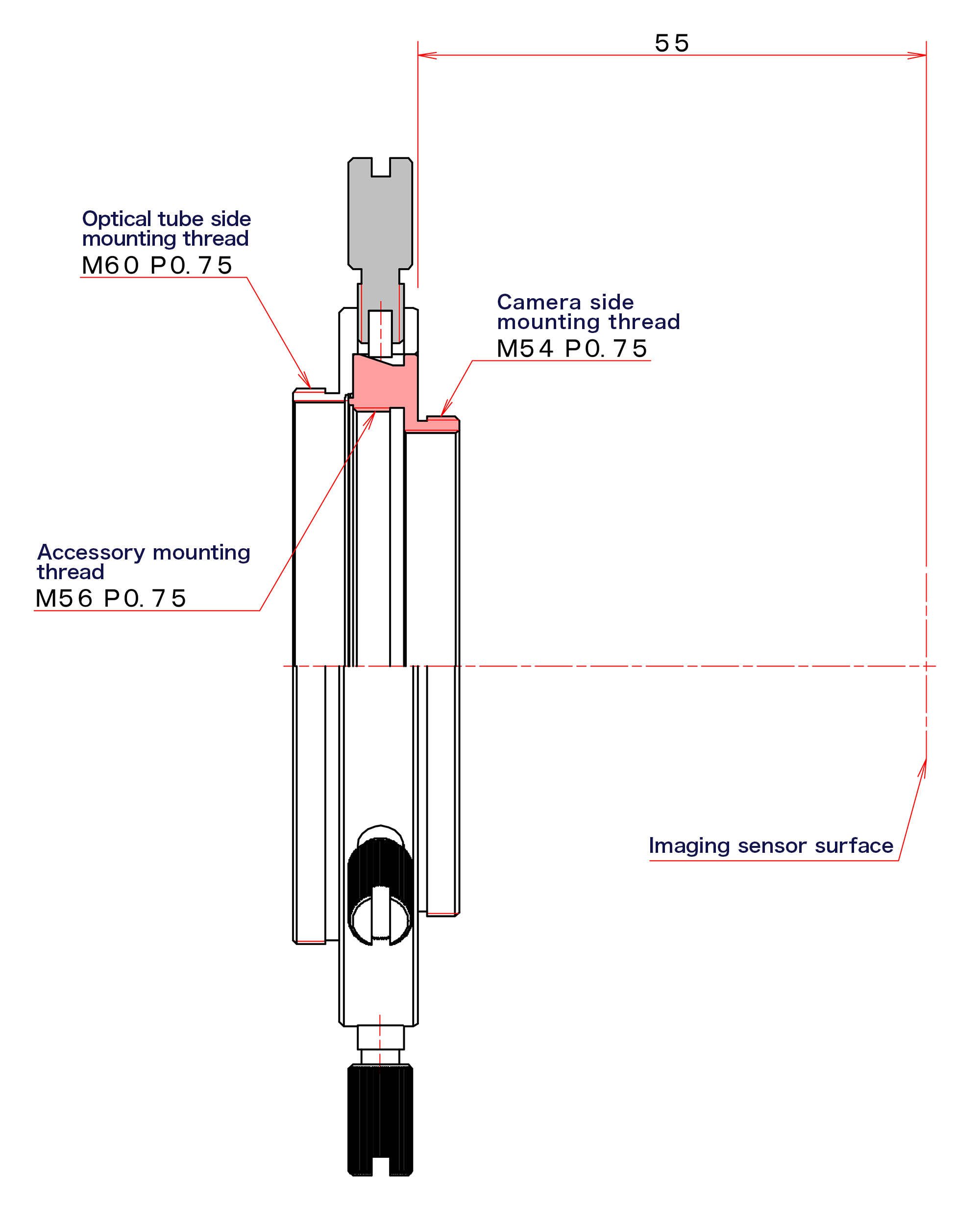 In combination with the Camera Adapter 60 for M48 (sold separately), you can attach an instrument or accessory with 54 mm (pitch 0.75mm) threads to the focusers of Vixen optical tubes. This setup helps minimize vignetting caused by camera accessories when imaging with a full-frame sensor or dual-chip CMOS camera.